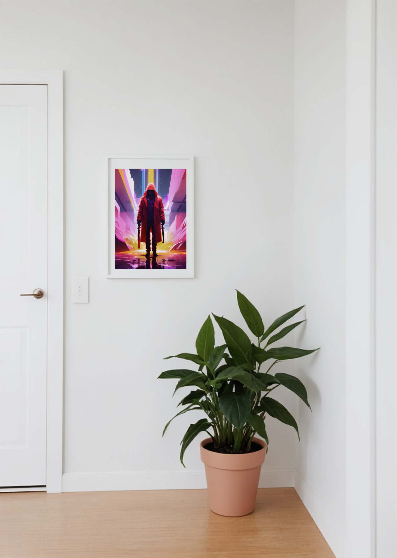 Holen Sie sich die aufregende Atmosphäre einer futuristischen Welt in Ihr Zuhause mit dem Poster „The Enigmatic Guardian“. Dieses kraftvolle Kunstwerk zeigt eine mysteriöse, maskierte Figur in einem markanten roten Mantel, die in einem lebhaften, neonfarbenen Szenario steht. Die leuchtenden Farben von Pink, Gelb und Blau schaffen einen eindrucksvollen Kontrast, der die Szene dynamisch und fesselnd macht. Der Held strahlt Entschlossenheit aus, während die futuristische Umgebung das Gefühl von Abenteuer und Spannung vermittelt.
